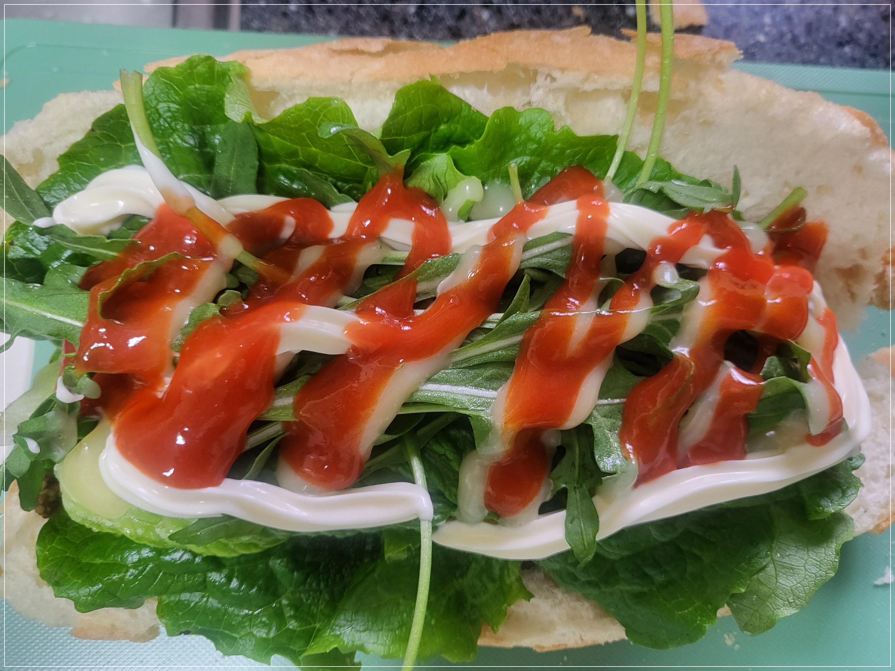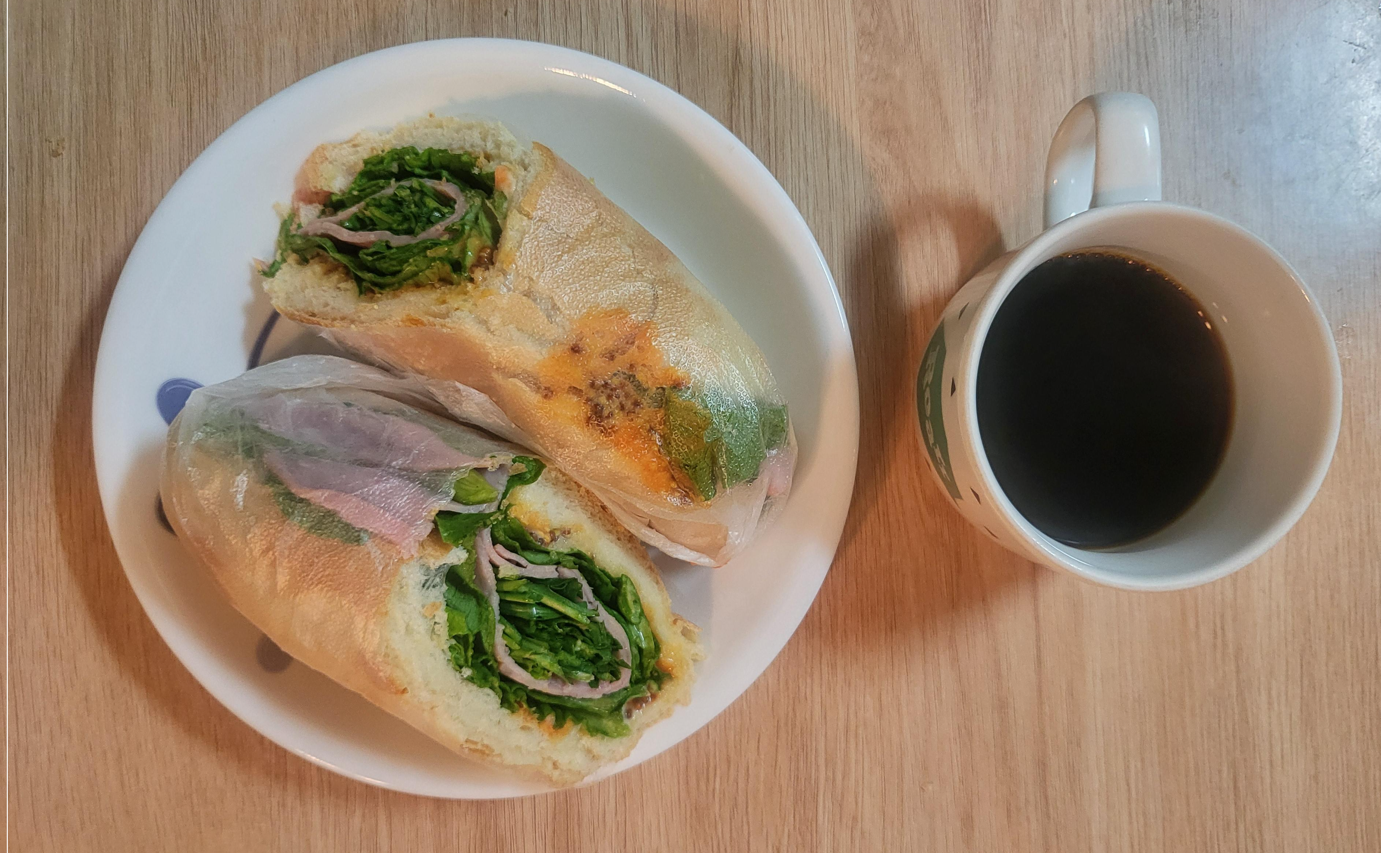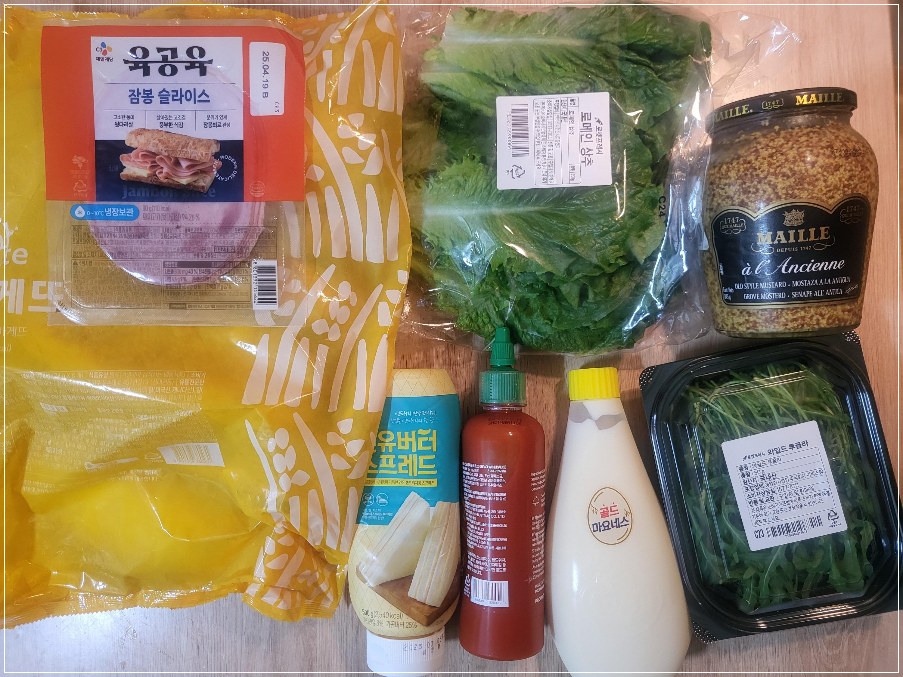 :반미 빵, 잠봉, 로메인 상추, 루꼴라, 연유버터, 스리라차, 마요네즈, 홀그레인 머스터드