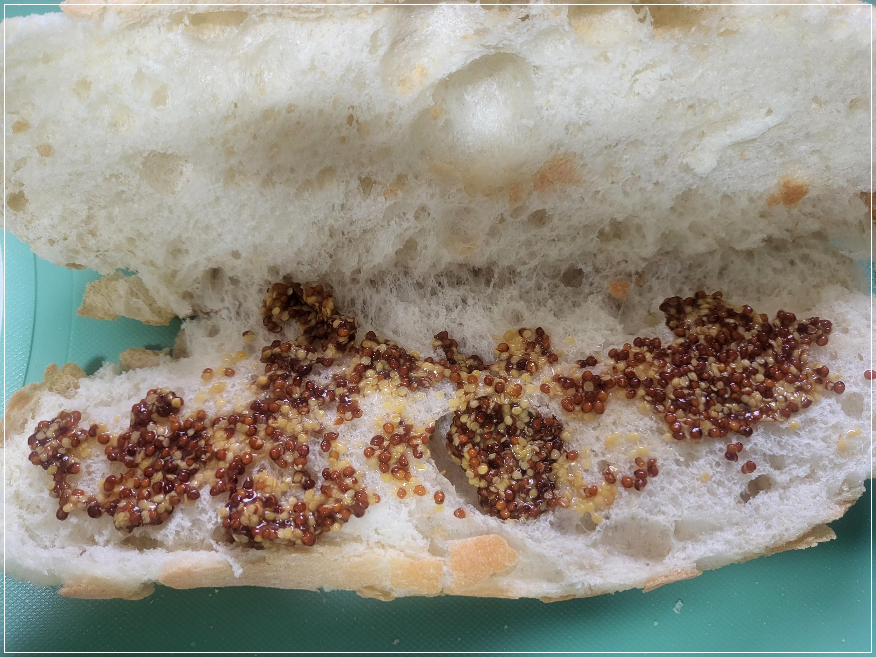 빵을 반으로 갈라서 홀그레인 머스터드소스를 발라요. 스테이크를 먹을 때 즐겨먹기 때문에 코스트코에서 큰 사이즈로 사놓고 쓰고 있어요.