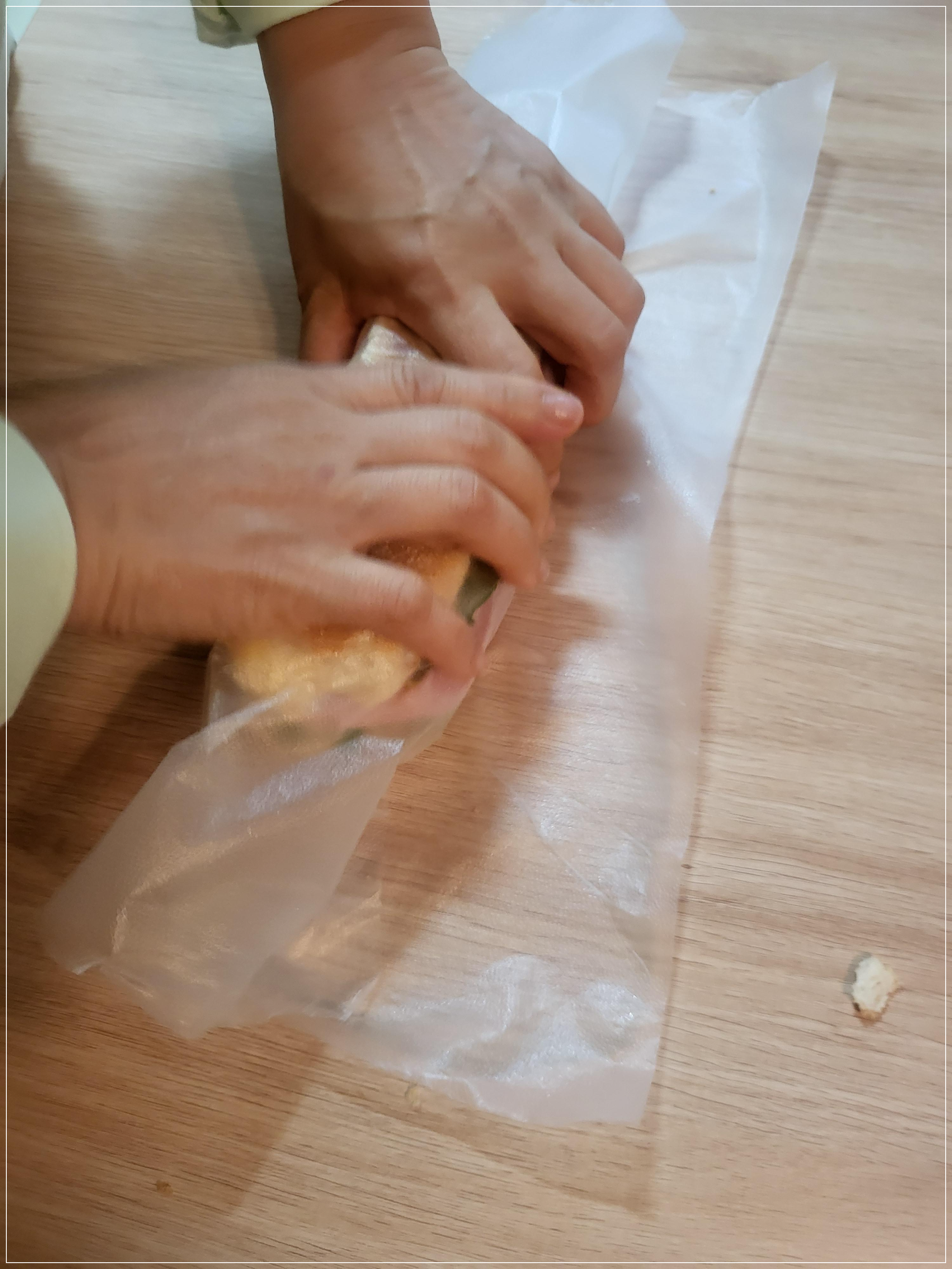 잠봉도 넣고 이대로 접어서 먹어도 좋지만 빵 부스러기나 소스, 야채가 튀어나오는 것을 방지하기 위애 랩으로 김밥 말듯이 한번 싸줘요. 그럼 손에도 묻지 않고 소스로 옷을 더럽히는 일이 없을 거예요.
