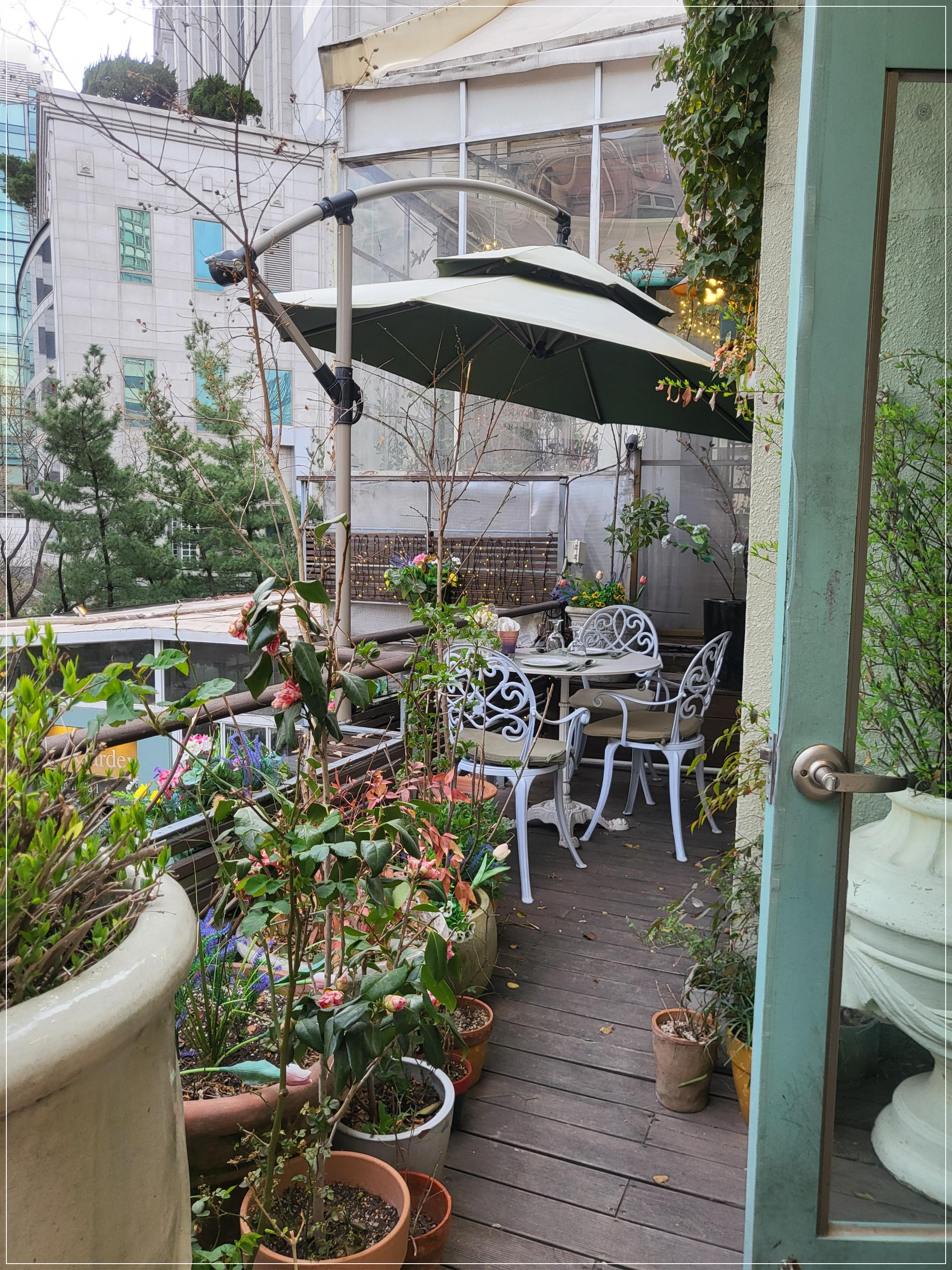 2층을 올라가다 보니 이쁜 테라스에도 테이블이 있네요. 날씨가 좋은 날에는 밖에서 먹는 것도 너무 좋을 것 같아요.