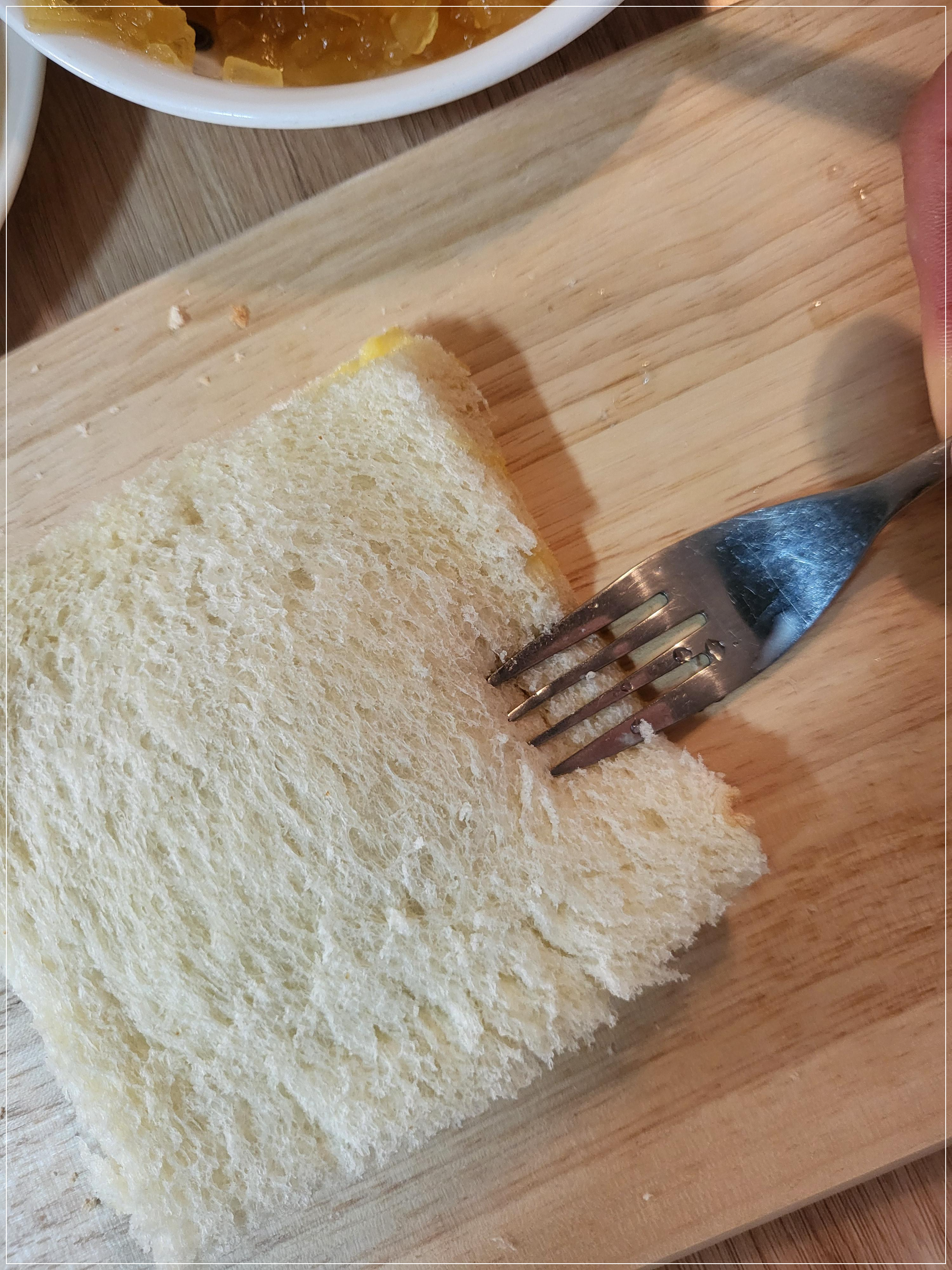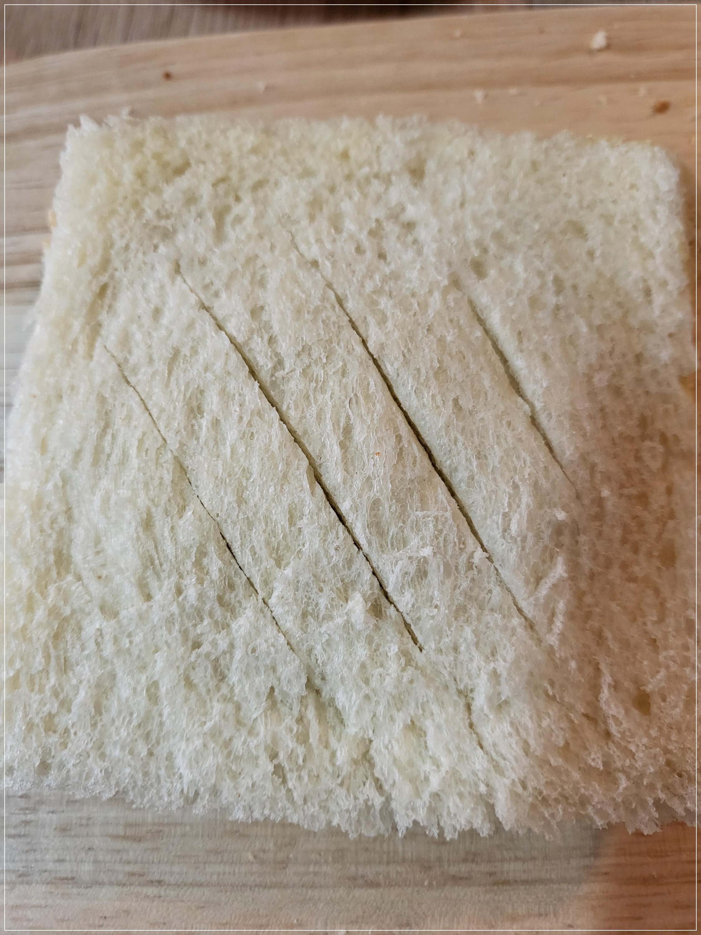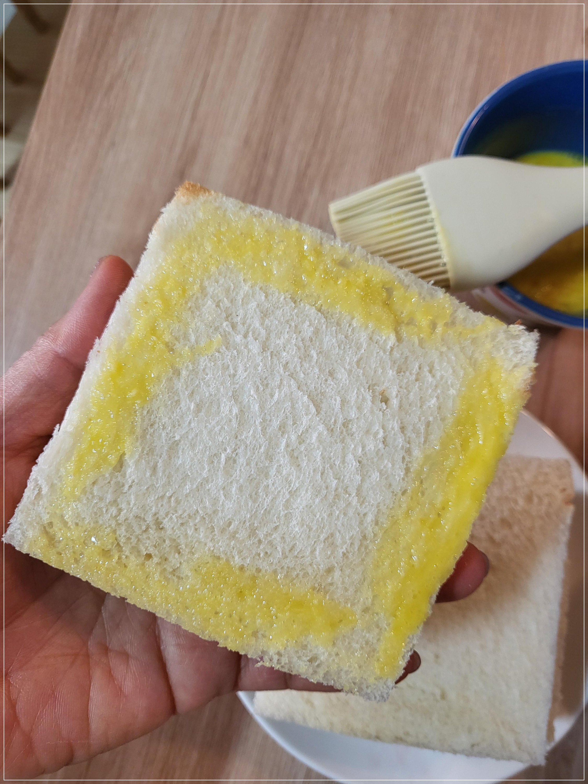 식빵의 테두리를 자른 후 가장자리는 계란물을 묻혀줘요. 빨기라 잘 붙어있으라는 접착제 역할을 해줘요.