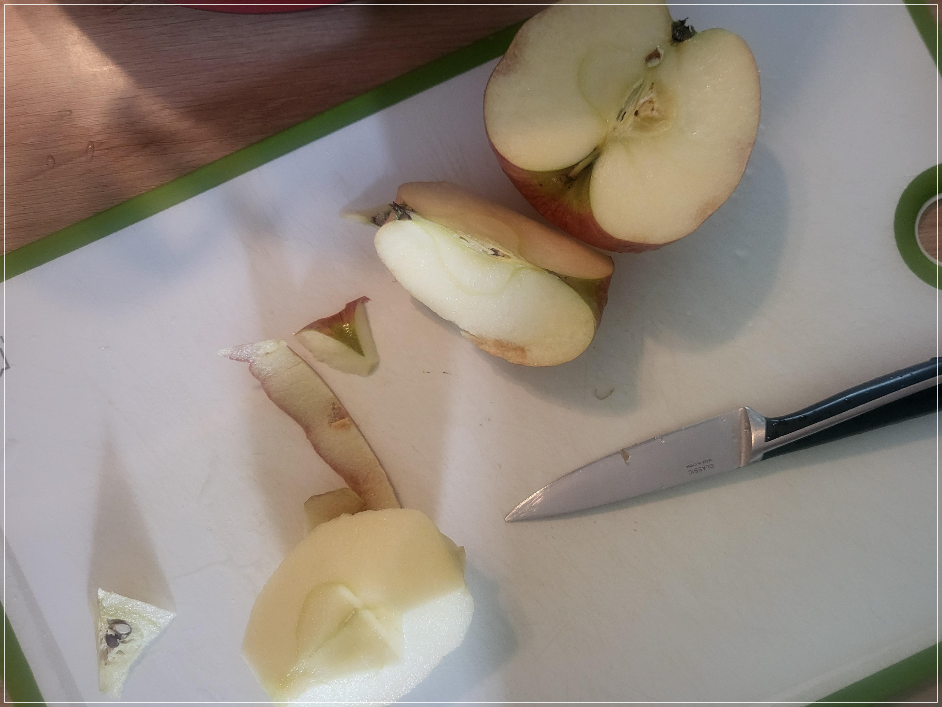 먼저, 사과를 잘 씻고 껍질을 벗긴 후, 적당한 크기로 썰어주세요.