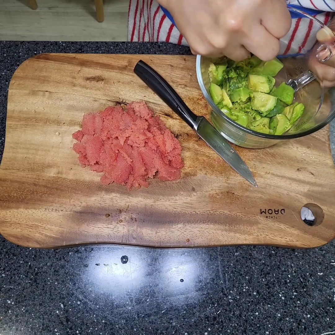 5. 아보카도명란을 얹어요.