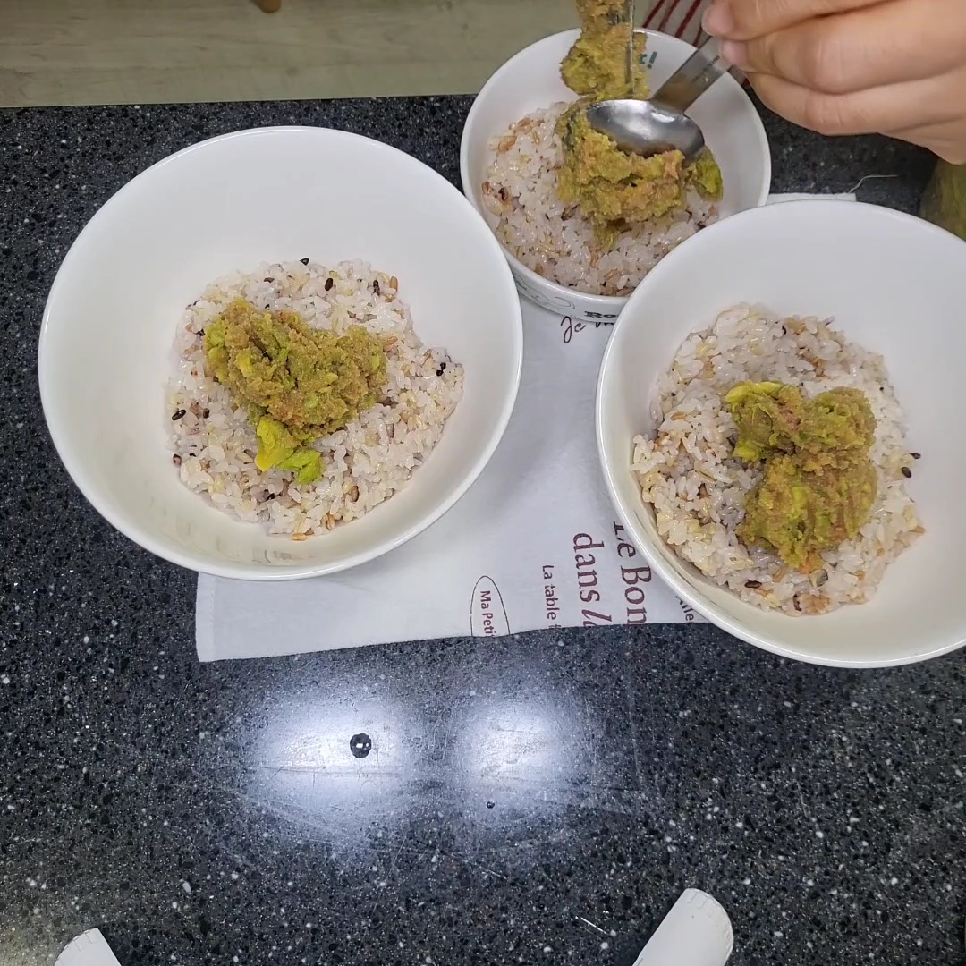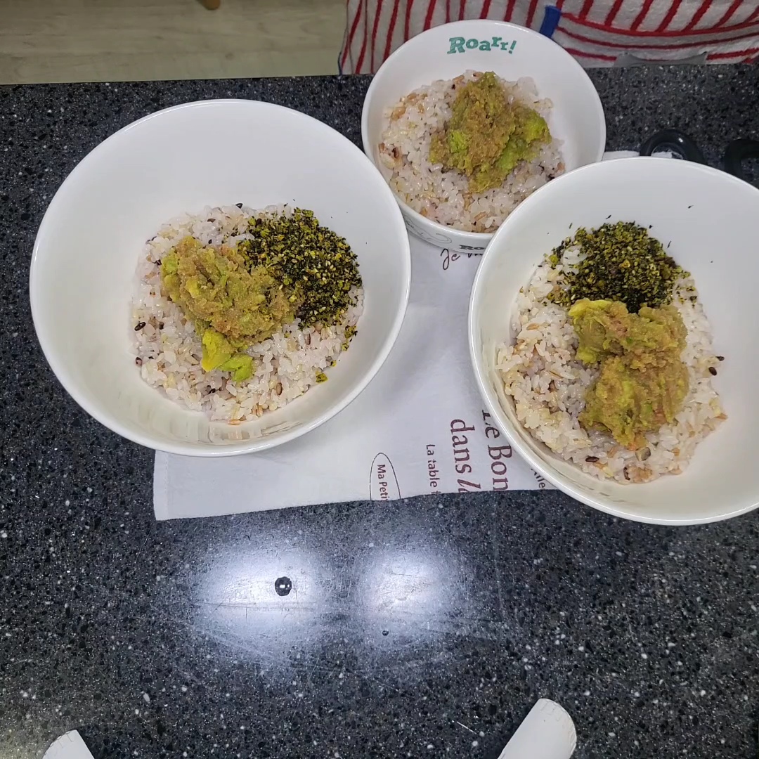 냉동아보카도, 명란젓, 계란, 즈유(없으면 진간장), 후리카케