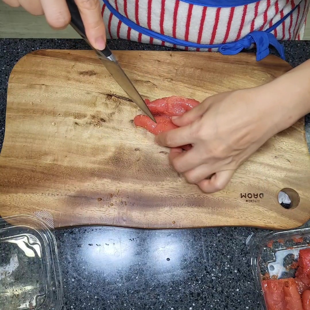 2. 명란젓 껍질을 벗겨요. 칼등을 사용하면 쉬워요.